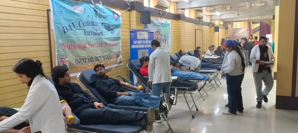 डी.ए.वी. शताब्दी कॉलेज एलुमनाई एसोसिएशन और रोटरी क्लब ऑफ फरीदाबाद संस्कृति एवं रोटरी क्लब ऑफ फरीदाबाद ग्रेटर के सहयोग से महाविद्यालय में N.S.S. (बॉयज़ एवं गर्ल्स यूनिट), एन.सी.सी. (बॉयज़ एवं गर्ल्स यूनिट) और वाई.आर.सी. (बॉयज़ एवं गर्ल्स यूनिट) द्वारा रक्तदान शिविर का आयोजन किया गया। इस आयोजन ने समाज में एक सकारात्मक संदेश दिया और भविष्य में इस प्रकार के और आयोजनों की आवश्यकता पर बल दिया गया। शिविर में महाविद्यालय के शिक्षकों, गैर-शिक्षक कर्मचारियों और विद्यार्थियों ने उत्साहपूर्वक भाग लिया और कुल मिलाकर 44 यूनिट रक्त एकत्रित किया गया। इस अवसर पर, शिविर में स्वास्थ्य सुरक्षा मानकों का पूरी तरह पालन किया गया और रक्तदाताओं के लिए चिकित्सा जाँच, अल्पाहार और विश्राम की पूरी व्यवस्था की गई।