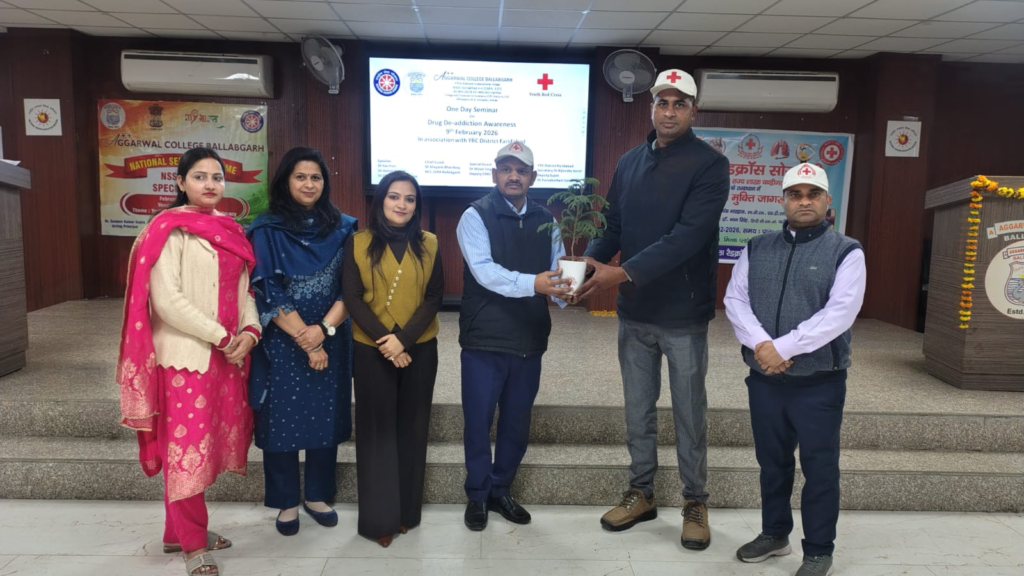 भारतीय रेडक्रॉस सोसाइटी, हरियाणा राज्य शाखा के उपाध्यक्ष अंकुश मिगलानी, महासचिव डॉ. सुनील कुमार के निर्देशानुसार तथा आयुष सिन्हा उपायुक्त एवं अध्यक्ष जिला रेडक्रॉस सोसाइटी फरीदाबाद के मार्गदर्शन में एवं सचिव बिजेंद्र सोरोत के नेतृत्व में “एक दिवसीय नशा मुक्ति जागरूकता सेमिनार” का आयोजन अग्रवाल कॉलेज बल्लबगढ़ में किया गया। डॉ मान सिंह, उप सिविल सर्जन ने बतौर विशिष्ट अतिथि के रूप में शिरकत की। उन्होंने युवाओं को जागरूक करते हुए अपील की कि यदि कोई नशा करे तो अपने माता पिता से भाई बहन से प्यार करने का नशा करे, समाज की तरक्की की सोच का नशा करे, देश प्रेम का नशा करे न कि बोतल, बीड़ी, सिगरेट आदि का नशा करे।