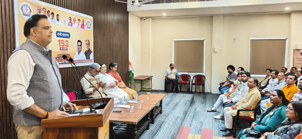 भारतीय जनता पार्टी फरीदाबाद द्वारा जिला कार्यालय “अटल कमल” पर जिला अध्यक्ष पंकज पूजन रामपाल के नेतृत्व में भाजपा नेताओं और कार्यकर्ताओं ने भारत के गौरव, एकता और स्वतंत्रता के प्रतीक राष्ट्रीय गीत ‘वंदेमातरम्’ की 150वीं वर्षगांठ बड़ी धूमधाम से देशभक्ति की भावना के साथ मनाई गई। इस ऐतिहासिक अवसर पर उपस्थित लोगों ने हाथों में तिरंगा लेकर राष्ट्र गीत वंदेमातरम् का वाचन किया । पूरा परिसर भारत माता के जयकारों और देशभक्ति गीतों से गूंज उठा। केंद्रीय मंत्री कृष्णपाल गुर्जर ने सभी को स्वदेशी अपनाने की शपथ दिलाई और उपस्थित लोगों ने स्वदेशी संकल्प पत्र भरकर आत्मनिर्भर भारत के प्रति अपनी प्रतिबद्धता दोहराई।