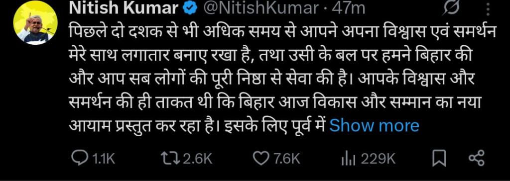 बिहार की राजनीति में एक बड़ा मोड़ सामने आया है। मुख्यमंत्री Nitish Kumar ने सोशल मीडिया प्लेटफॉर्म X पर भावुक संदेश साझा करते हुए सक्रिय राज्य राजनीति से हटकर राज्यसभा जाने की इच्छा जाहिर की है। उन्होंने पिछले 2 दशकों से मिले जनसमर्थन के लिए जनता का आभार जताया और कहा कि इसी भरोसे की बदौलत उन्होंने बिहार की सेवा की। नीतीश कुमार ने अपने संदेश में बताया कि संसदीय जीवन की शुरुआत से ही उनकी इच्छा रही है कि वे बिहार विधानमंडल के दोनों सदनों के साथ-साथ संसद के दोनों सदनों का भी सदस्य बनें। इसी लक्ष्य को पूरा करने के लिए वे इस बार राज्यसभा का सदस्य बनने की तैयारी कर रहे हैं।