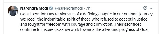 प्रधानमंत्री मोदी ने गोवा मुक्ति दिवस पर स्वतंत्रता सेनानियों के बलिदान को याद किया