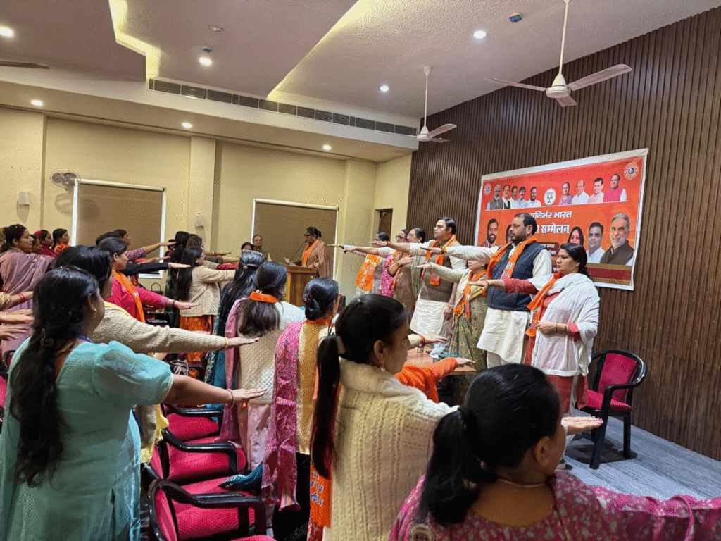 भारतीय जनता पार्टी फरीदाबाद द्वारा आत्मनिर्भर भारत अभियान के अंतर्गत एक भव्य महिला सम्मेलन का आयोजन किया गया, जिसमें जिले के विभिन्न सेल्फ हेल्प ग्रुप, एनजीओ, और सामाजिक संगठनों से जुड़ी बड़ी संख्या में महिलाओं ने उत्साहपूर्वक भाग लिया। सम्मेलन का उद्देश्य महिला शक्ति को आत्मनिर्भरता, स्वदेशी उत्पादों के संवर्धन, और राष्ट्र निर्माण से जोड़ना था। महिला सम्मलेन में जिला अध्यक्ष पंकज पूजन रामपाल, जिला प्रभारी नरेंद्र वत्स, पूर्व शिक्षा मंत्री सीमा त्रिखा, महापौर प्रवीण बत्रा जोशी, महिला मोर्चा अध्यक्ष राजबाला सरदाना, महिला मोर्चा सोशल मीडिया राष्ट्रीय संयोजिका टीना बैंटिक, आत्मनिर्भर भारत की लोकसभा संयोजिका अनीता शर्मा, जिला संयोजिका सीमा भारद्वाज मुख्य तौर पर उपस्थित रहे । इस अवसर पर उपस्थित सभी ने स्वदेशी अपनाने और स्वदेशी का प्रचार प्रसार करने की शपथ ली ।