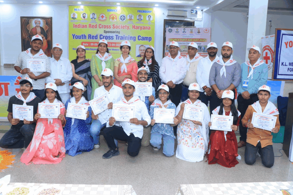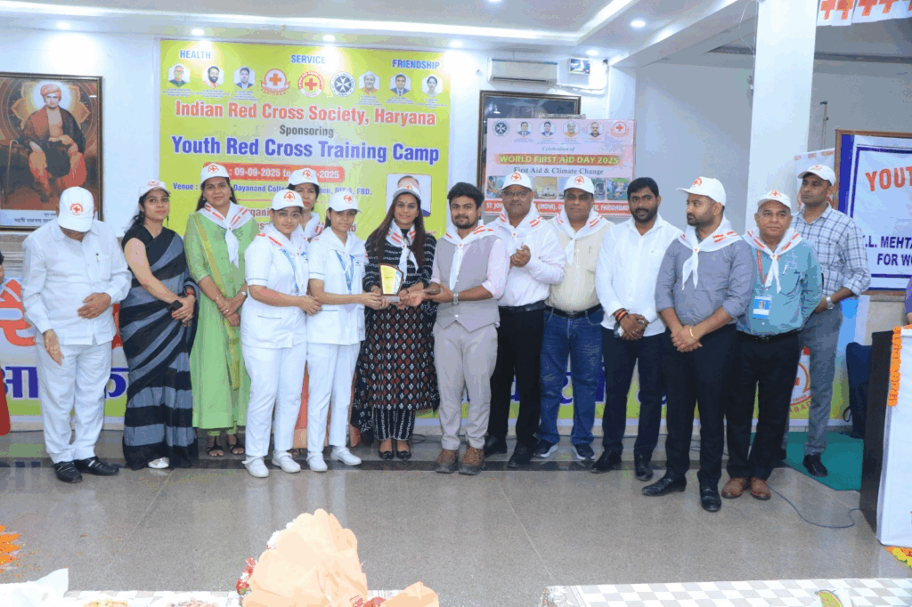 अंकुश मिगलानी, उपाध्यक्ष व महेश जोशी, महासचिव भारतीय रेडक्रॉस सोसाइटी हरियाणा राज्य शाखा चंडीगढ़ से प्राप्त निर्देशानुसार एवं विक्रम सिंह, उपायुक्त एवं प्रधान जिला रेडक्रॉस सोसायटी फरीदाबाद के कुशल मार्गदर्शन व एवं सचिव बिजेंद्र सौरोत के नेतृत्व में 9 सितम्बर से 13 सितम्बर तक के० एल० मेहता दयानन्द महिला महाविद्यालय, ऍन० आई० टी० 3, फरीदाबाद के प्रांगण में यूथ रेडक्रॉस प्रशिक्षण शिविर का आयोजन किया गया | इस 5 दिवसीय शिविर के समापन समारोह में बतौर मुख्य अतिथि नेहा सहारण, तहसीलदार बड़खल ने शिरकत की | उन्होंने यूथ रेडक्रॉस समापन समारोह के अवसर पर विभिन्न कॉलेजों से आए प्रतिभागियों जिन्होंने विभिन्न प्रतियोगियों में स्थान हासिल किया था उनको पुरस्कार देकर सम्मानित किया। उन्होंने अपने संबोधन में युवाओं का मार्गदर्शन करते हुए बताया कि यूथ रेडक्रॉस स्वयंसेवक हर कठिन समय में बढ़-चढ़कर भाग लेते हैं। समाज में लोगों की सहायता के लिए तत्पर मौजूद रहते हैं। लोगों को समय-समय पर हर प्रकार की कुरीतियों से अवगत करवाते रहते हैं |